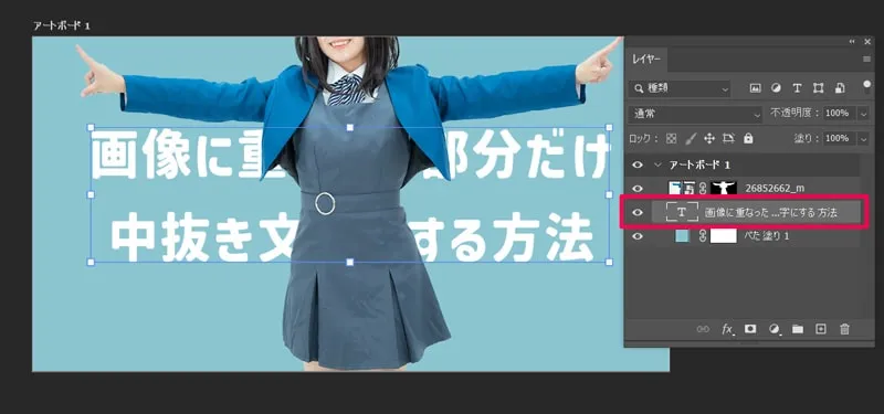先程のテキストレイヤーをコピーし、今度は女の子の画像のレイヤーの上に配置します。