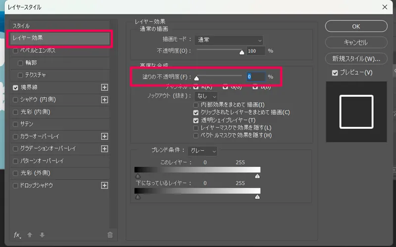 [ レイヤー効果 ] → [ 高度な合成 ] で [ 塗りの不透明度 ] を0%に設定します。